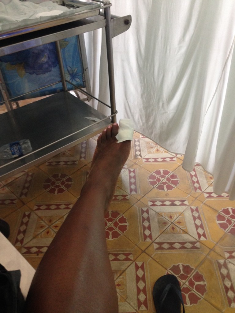 Unfortunately, we never made it to Sao Beach….well….we made it about 99.99% there. I must pause for a sec as this was QUITE the day. It started with us walking up and down the streets of Phu Quoc looking to rent a motorbike. No one would rent to us. It’s unclear why, as many of the dealers had multiple if not entire rows of bikes surrounding them. We noticed the people of Phu Quoc have a penchant for saying “NO” (harshly might I add) and then waving you away. We never figured out why no one would rent to us, but finally after two hours of walking the streets in the 95 degree heat, about to give up, a very nice lady agreed to rent to us. After walking in the blazing sun, it was a nice relaxing trip down the highway – a 38km ride, with the last 500 meters or so down a bumpy dirt road. We literally made it 37.9km (I have the pics to prove it—we were literally 100m from the beach) when all I heard was Ola hollering my name behind me. When I turned around, I saw her picking up her bike off the road. As I got closer, it only got worse. Poor Olsi had lost a TOE!!!!